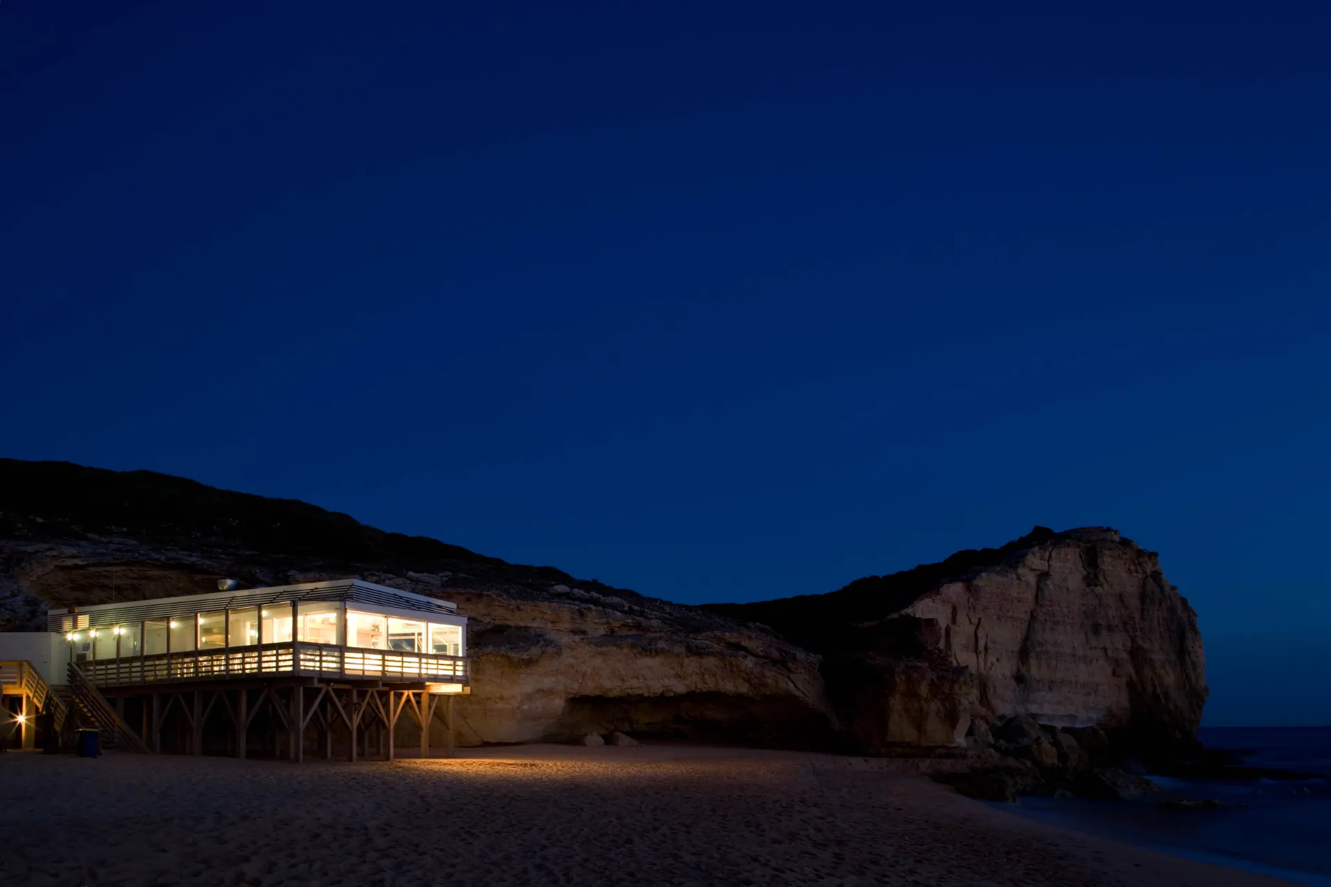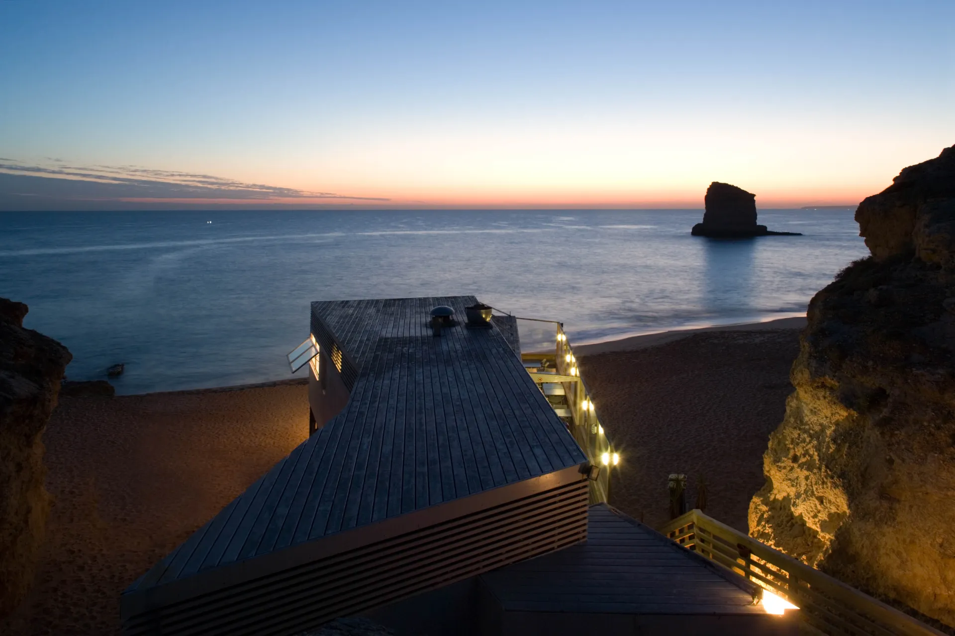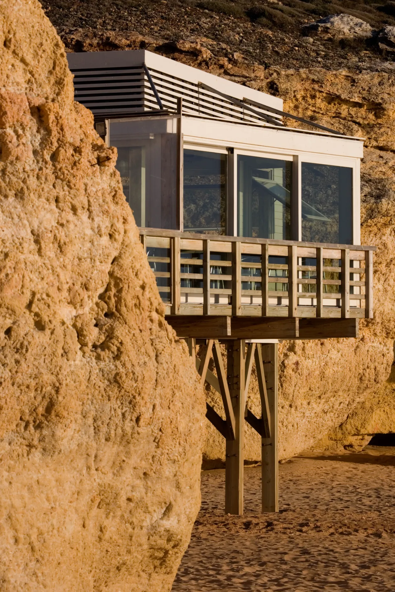A proposta é profundamente marcada pela prospecção geotécnica e pelo plano que, em conjunto, determinam a localização e a cota de pavimento do edifício: construído sobre estacaria, aparta-se da concavidade da falésia onde se anichava o anterior restaurante entretanto demolido, ocupando uma posição menos dissimulada. O perímetro de implantação, delimitado in situ, resulta do redesenho dos condicionalismos predeterminados: a nascente e a norte cumprindo a distância mínima de afastamento à falésia, a sul comportando o avanço máximo possível em relação ao mar e a poente traçando a “tangente” do acesso à praia e do eixo visual associado.
