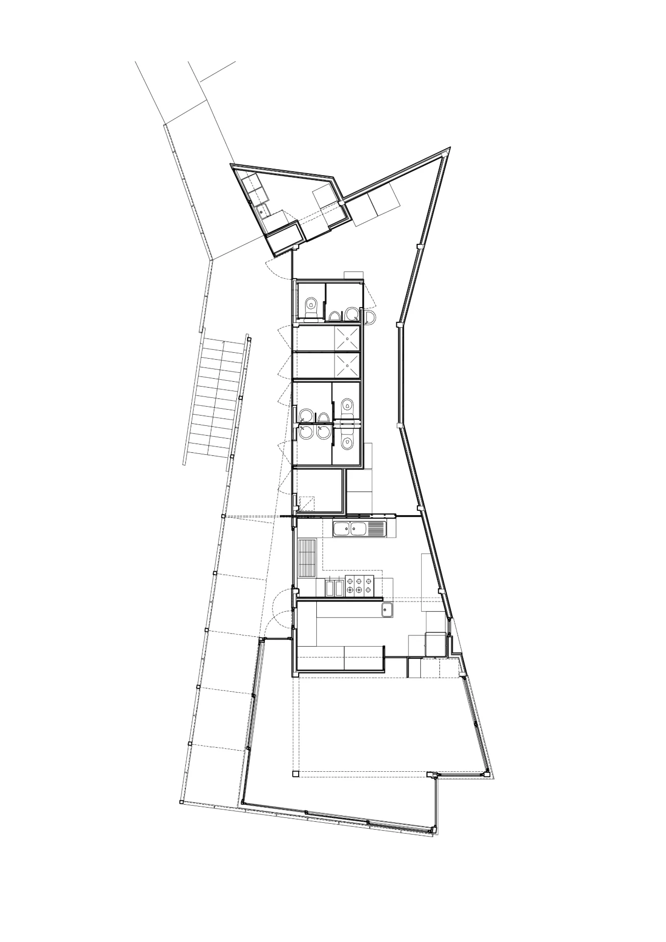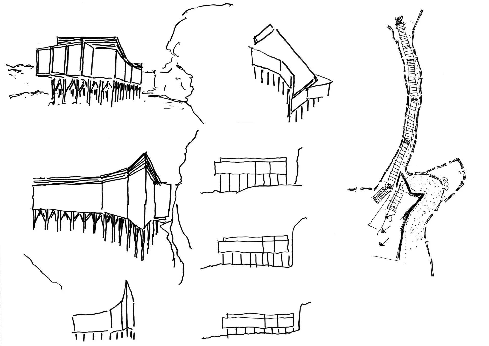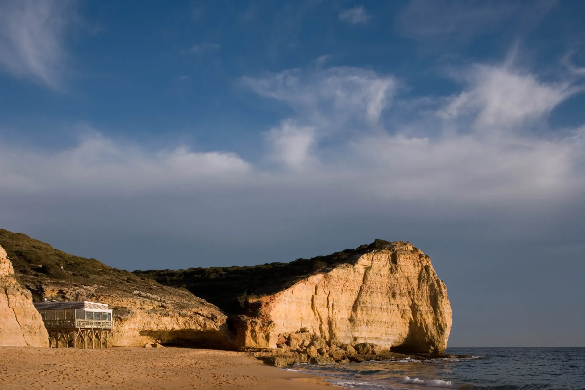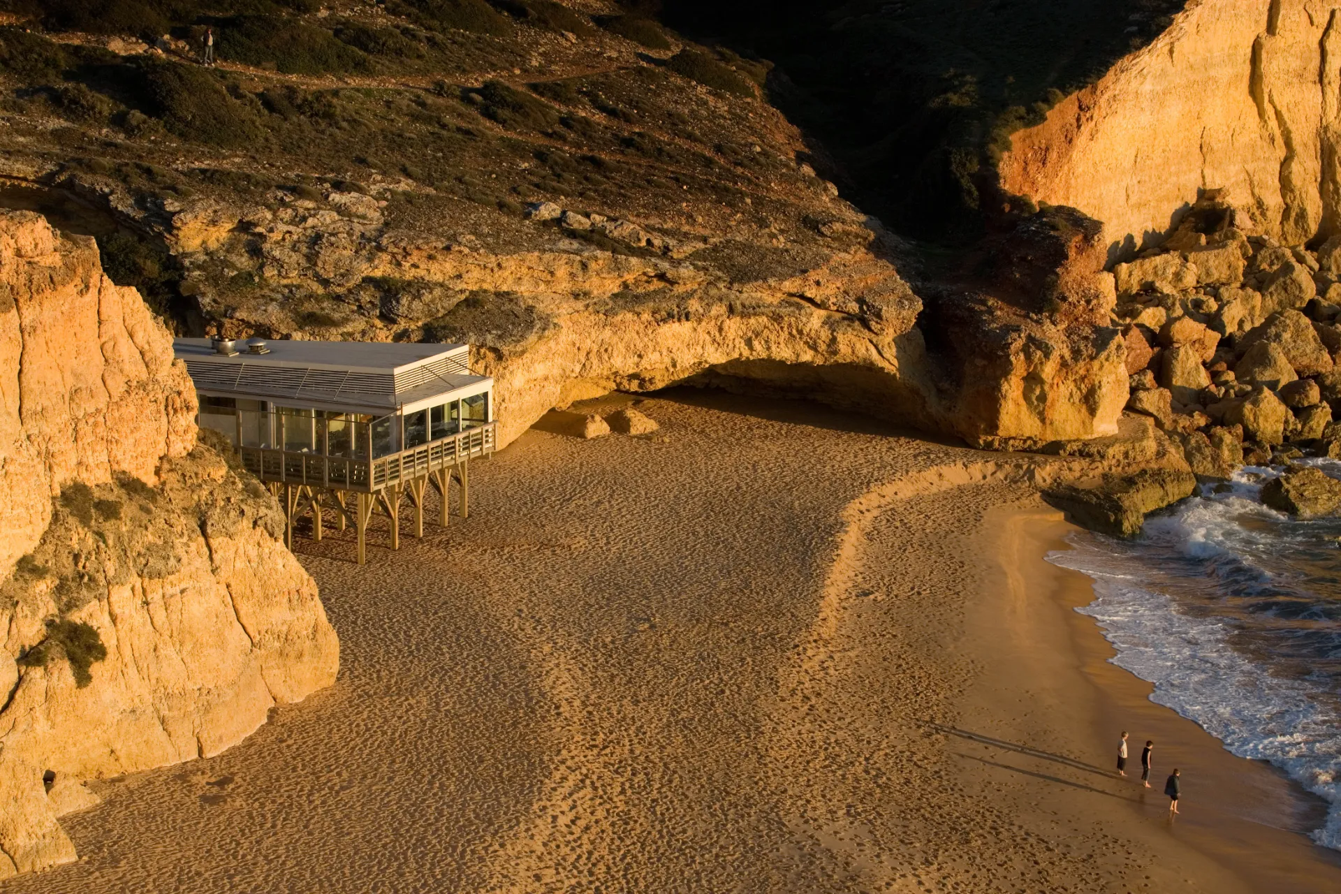 A proposta é profundamente marcada pela prospecção geotécnica e pelo plano que, em conjunto, determinam a localização e a cota de pavimento do edifício: construído sobre estacaria, aparta-se da concavidade da falésia onde se anichava o anterior restaurante entretanto demolido, ocupando uma posição menos dissimulada. O perímetro de implantação, delimitado in situ, resulta do redesenho dos condicionalismos predeterminados: a nascente e a norte cumprindo a distância mínima de afastamento à falésia, a sul comportando o avanço máximo possível em relação ao mar e a poente traçando a “tangente” do acesso à praia e do eixo visual associado.