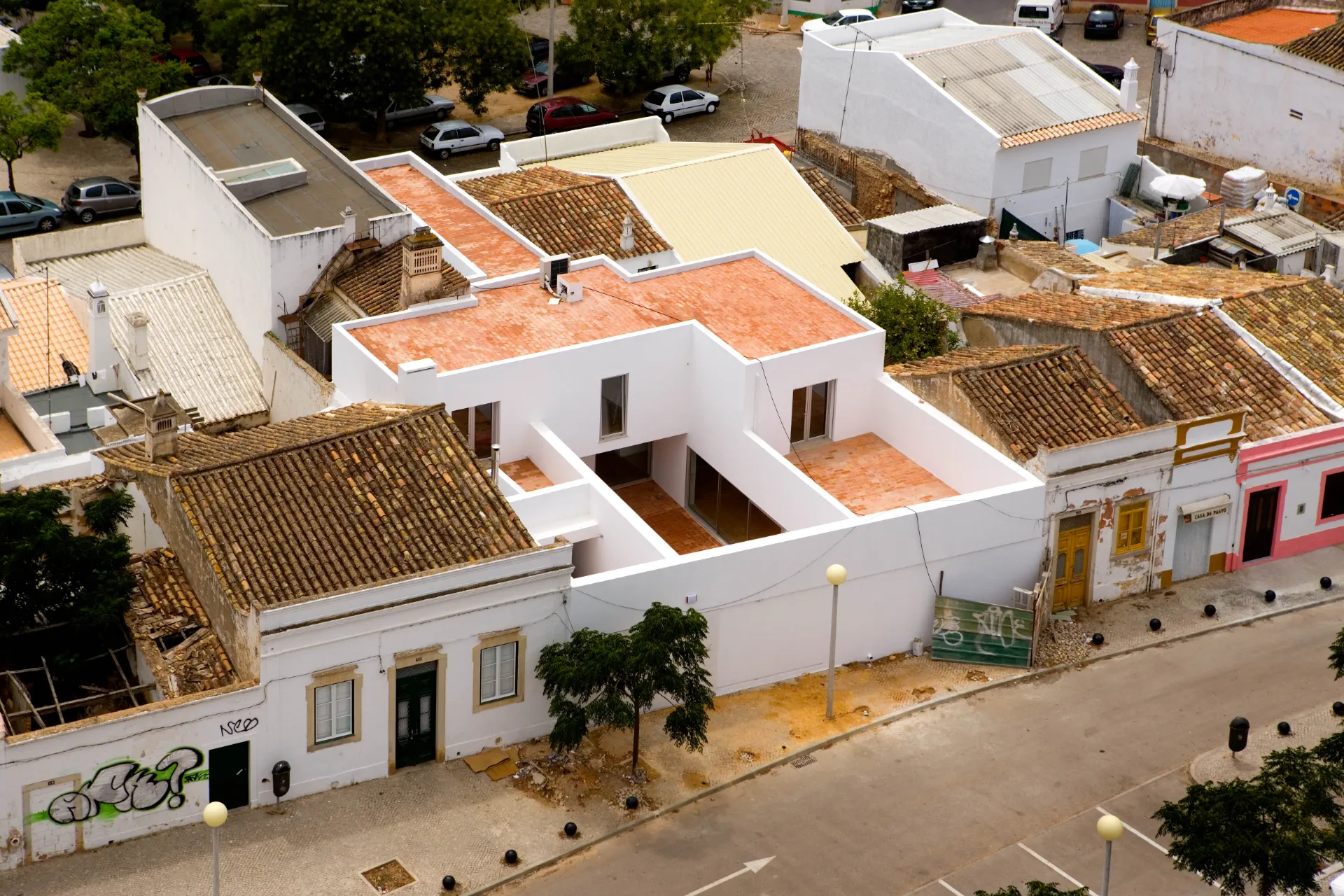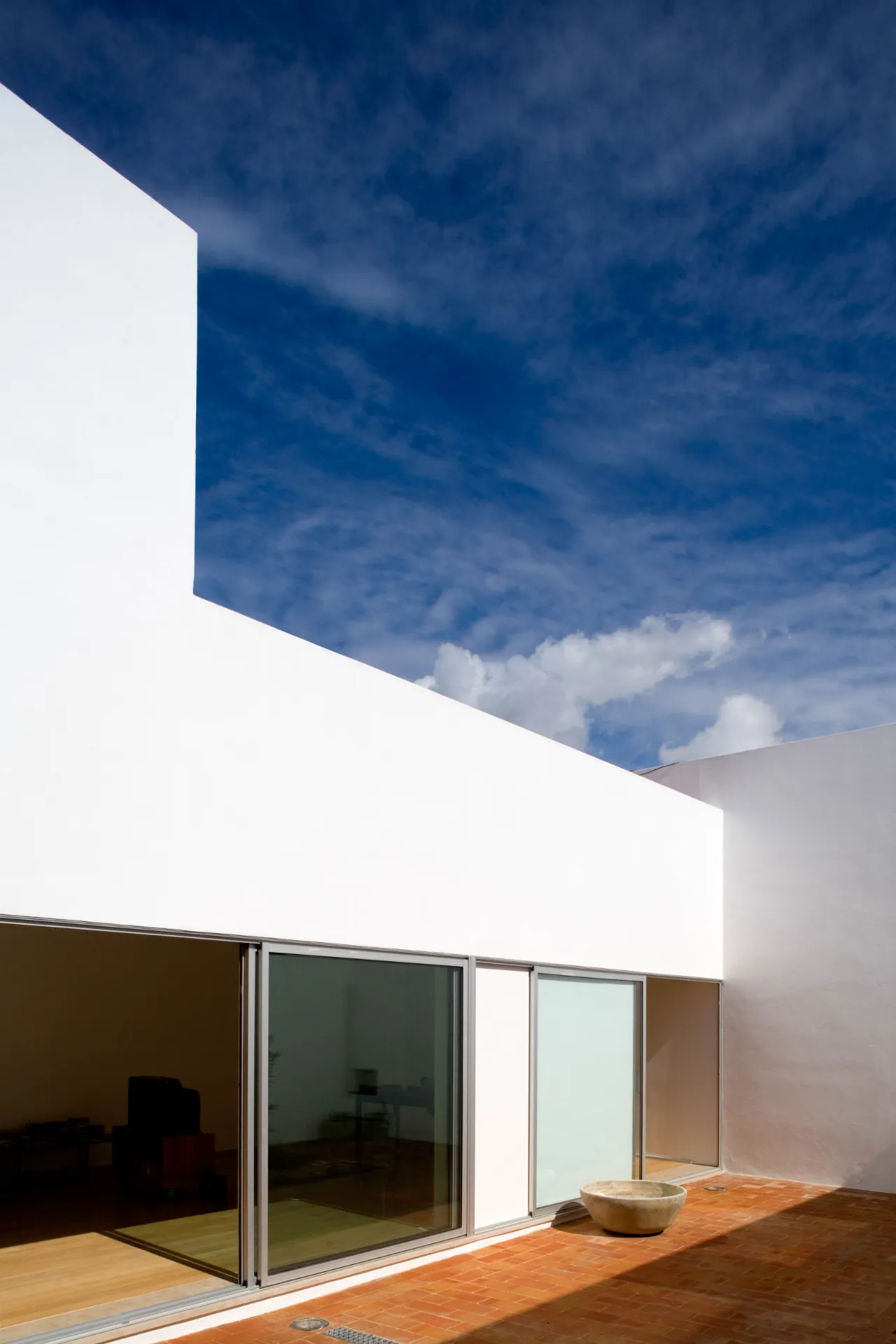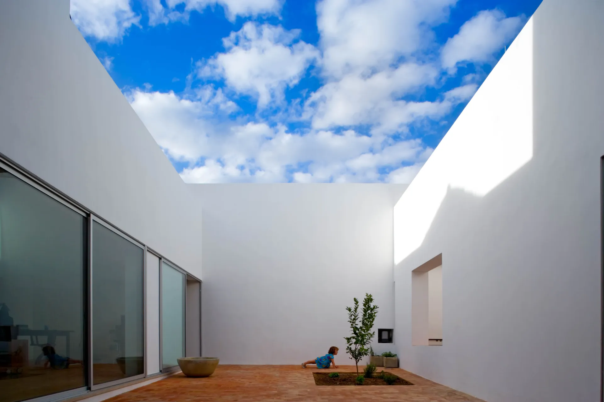 O pátio maior resulta da sobreposição do espaço do rectângulo alongado e do espaço do quadrado que se converte, frequentemente, num espaço único.