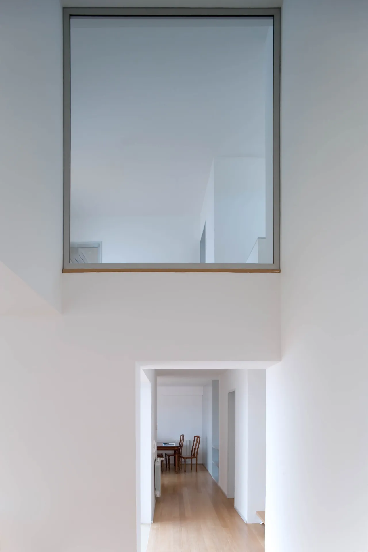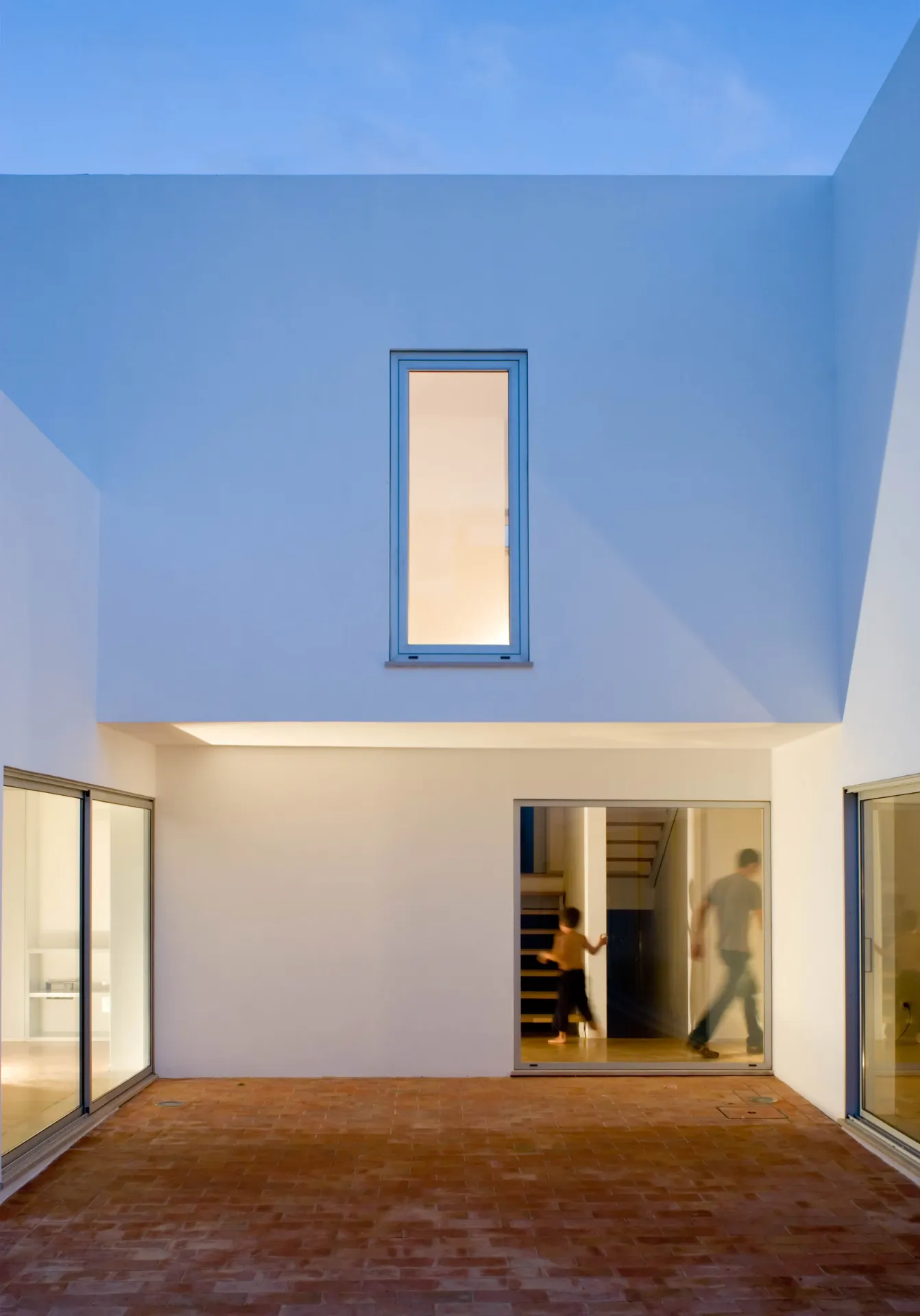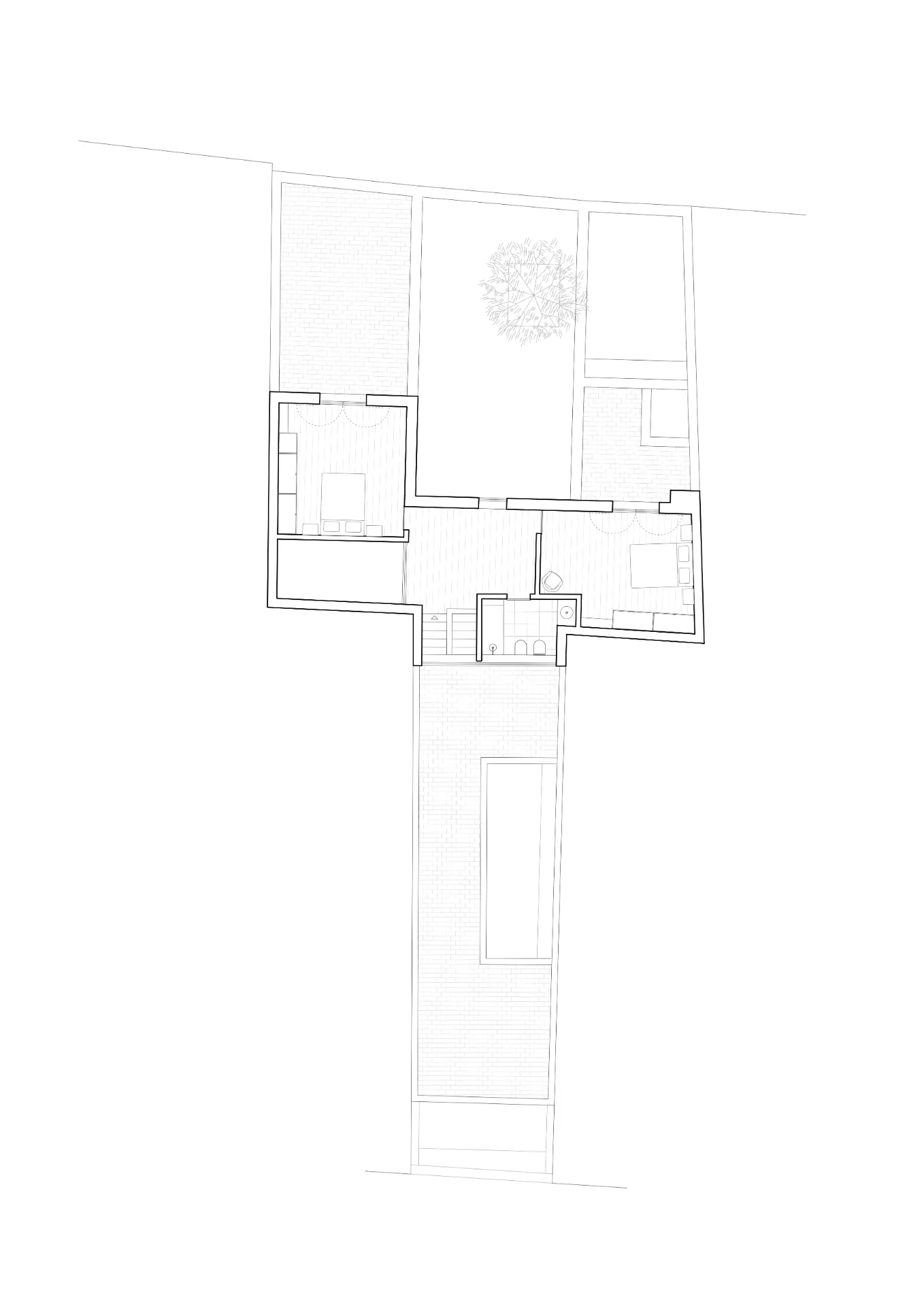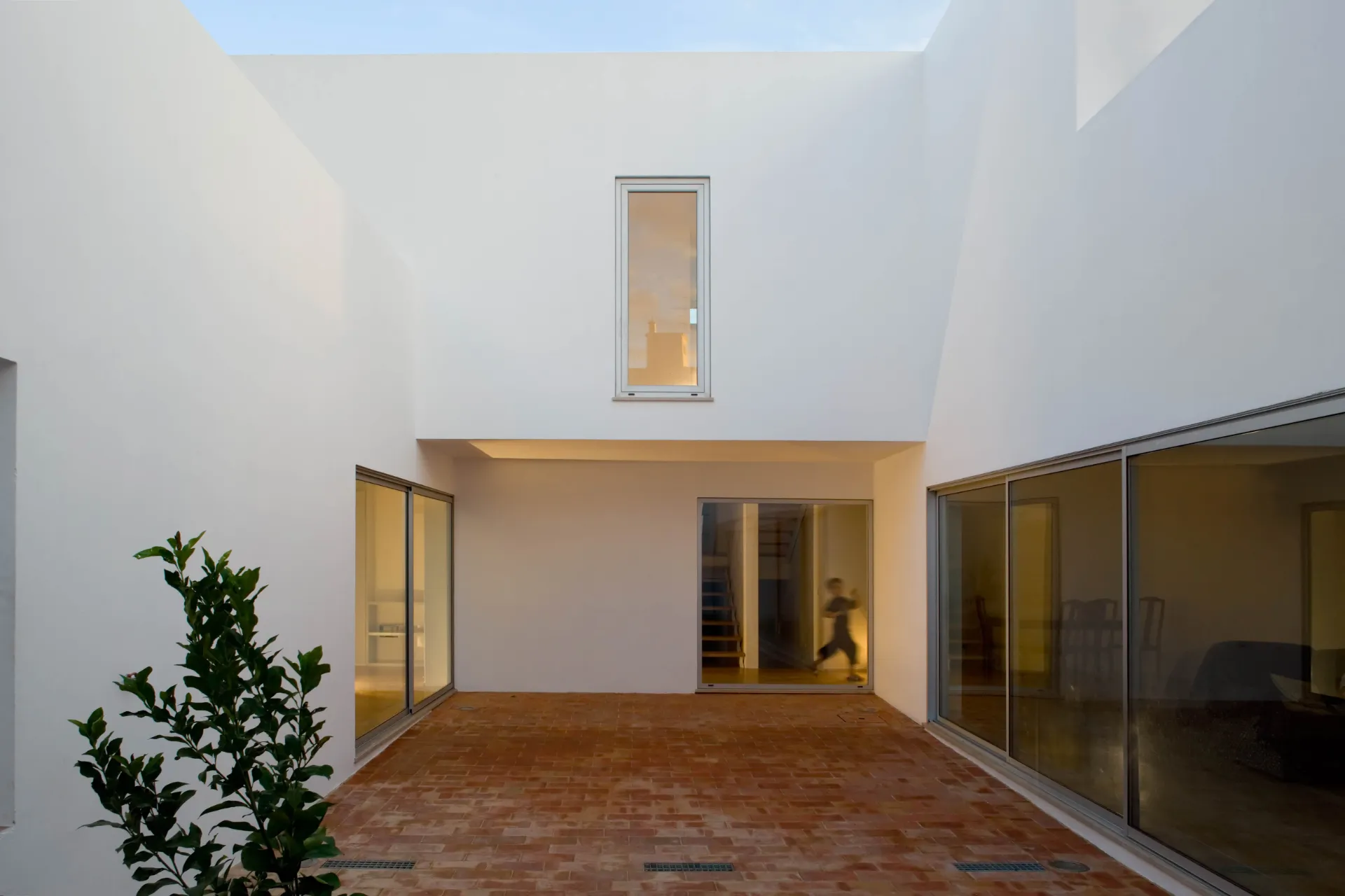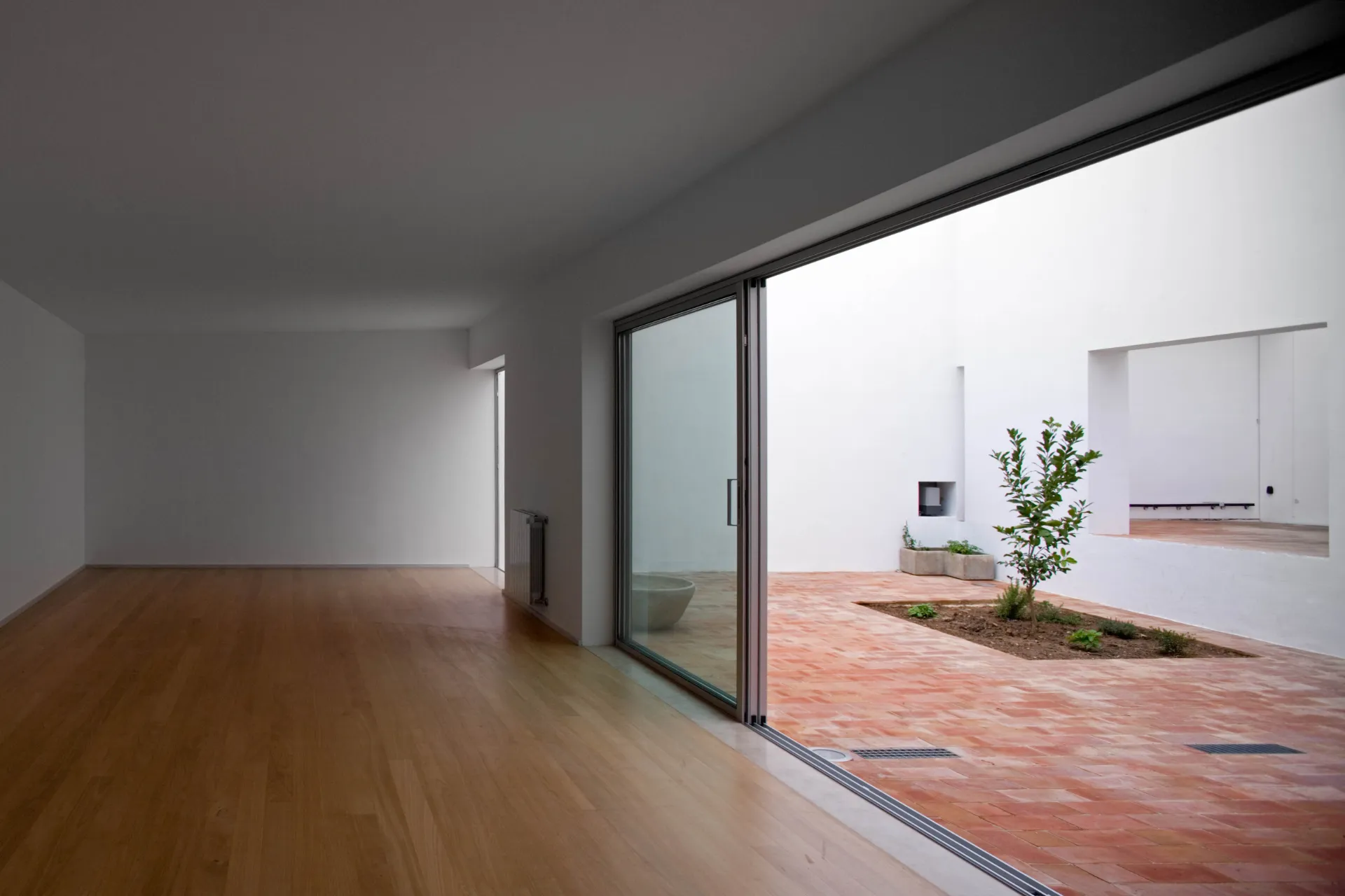 O pátio menor ocupa dois dos quartos, antes desprovidos de luz, do espaço do rectângulo onde se conserva a tipologia preexistente de distribuição através de corredor lateral.
