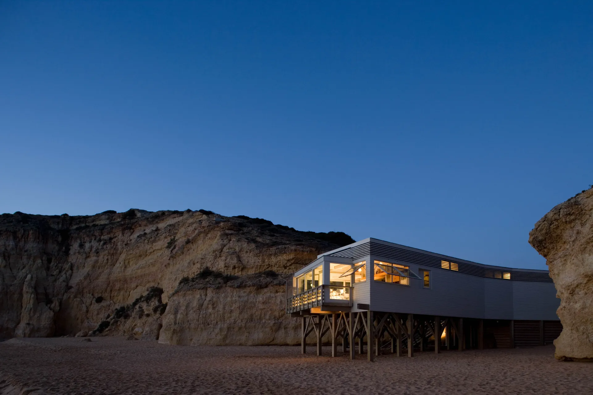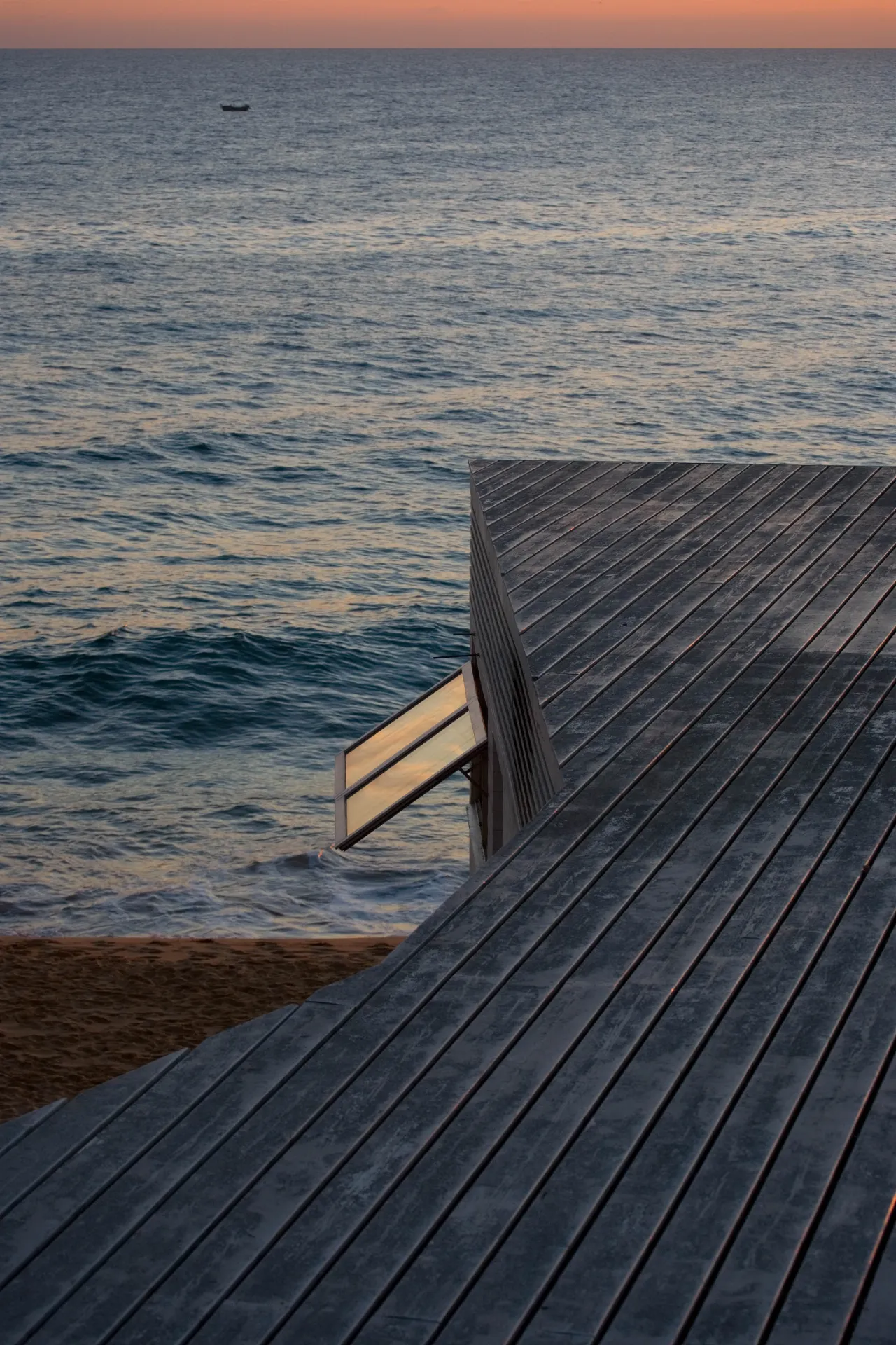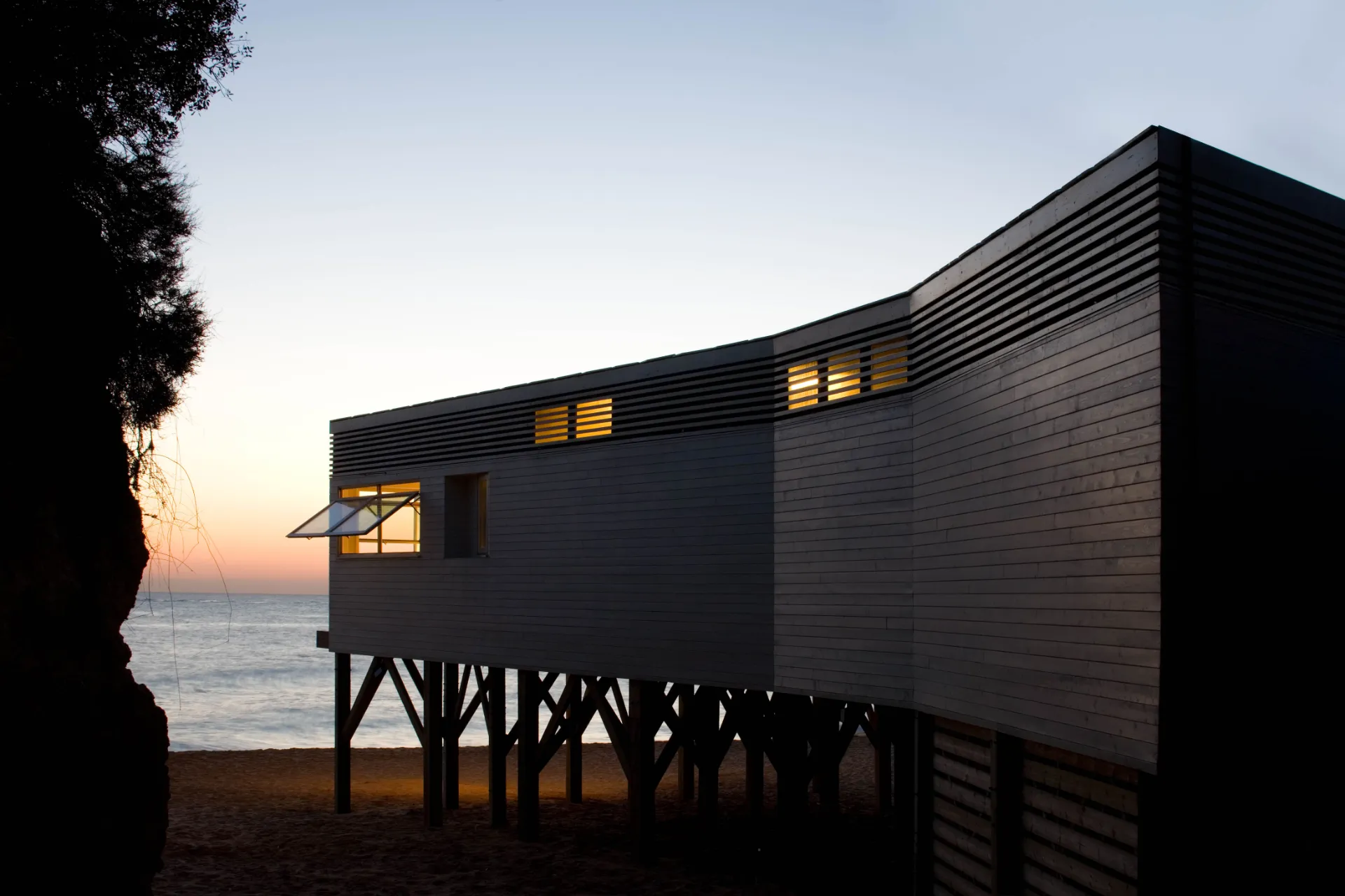 Le projet est fortement influencé par les études géotechniques et le plan qui, ensemble, déterminent l'emplacement et le niveau du sol du bâtiment : construit sur pilotis, il s'éloigne de la concavité de la falaise où se nichait l'ancien restaurant, aujourd'hui démoli, occupant une position moins dissimulée. Le périmètre d'implantation, délimité in situ, résulte de la réinterprétation de contraintes prédéterminées : à l'est et au nord, le respect de la distance minimale par rapport à la falaise ; au sud, l'avancée maximale possible vers la mer ; et à l'ouest, le tracé de la tangente de l'accès à la plage et de l'axe visuel associé.