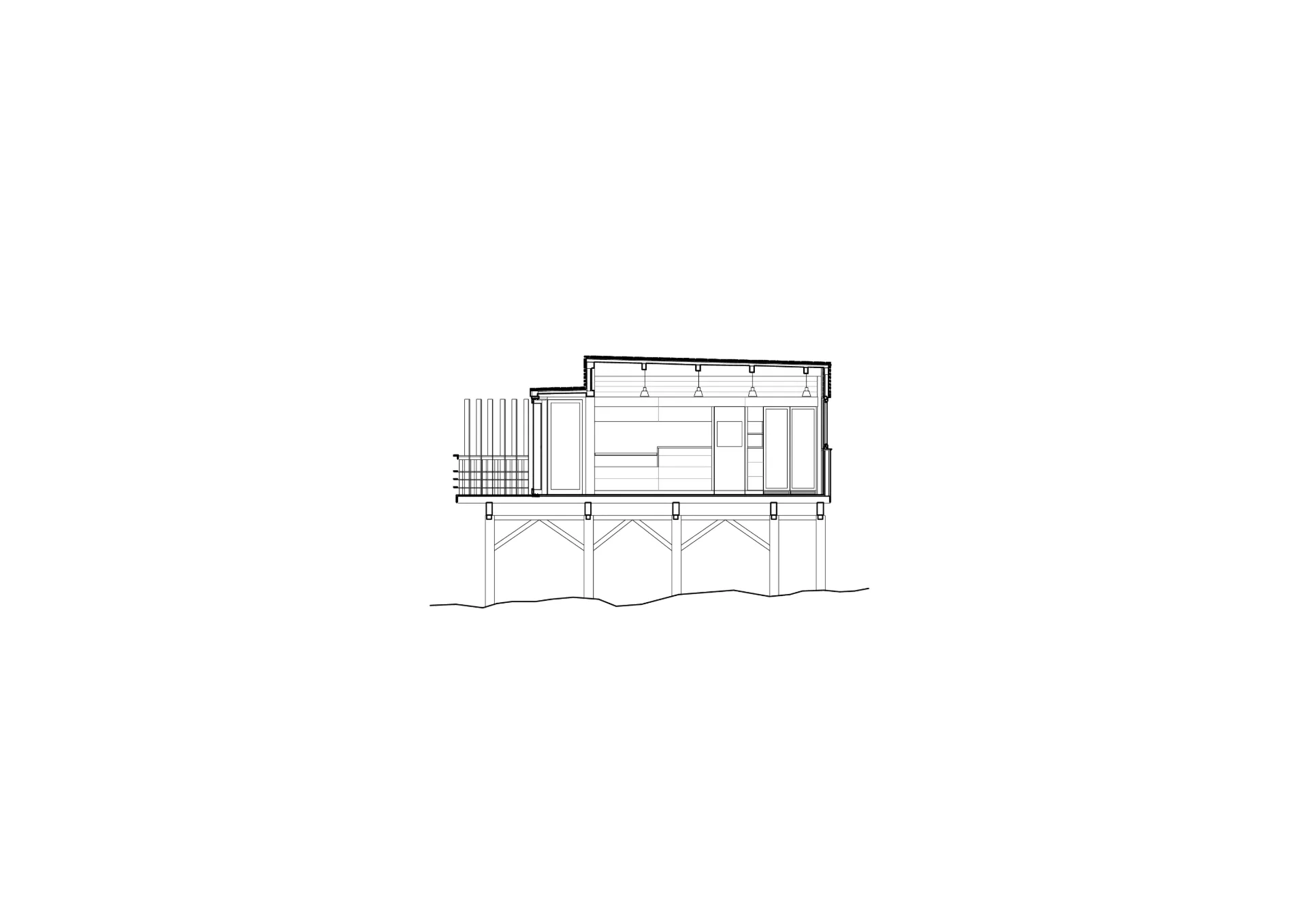 La distribution du programme s'organise autour d'une zone centrale regroupant les blocs sanitaires pour les installations de baignade et les espaces de services desservant les aires de restauration, situées en périphérie. Le projet prévoit également, dans le cadre de la redéfinition de l'accès à la plage, trois niveaux distincts de relation entre le bâtiment et le passage : une zone plus exposée pour la vente de glaces et d'eau ; une zone intermédiaire dédiée aux services d'assistance aux baigneurs, complétant les fonctions de surveillance de la plage ; et une zone plus intime correspondant au bar et au restaurant. L'articulation du service entre les différents espaces du restaurant est possible en interne grâce à une zone de stockage qui formalise la façade « aveugle », contrastant avec la falaise à l'est.