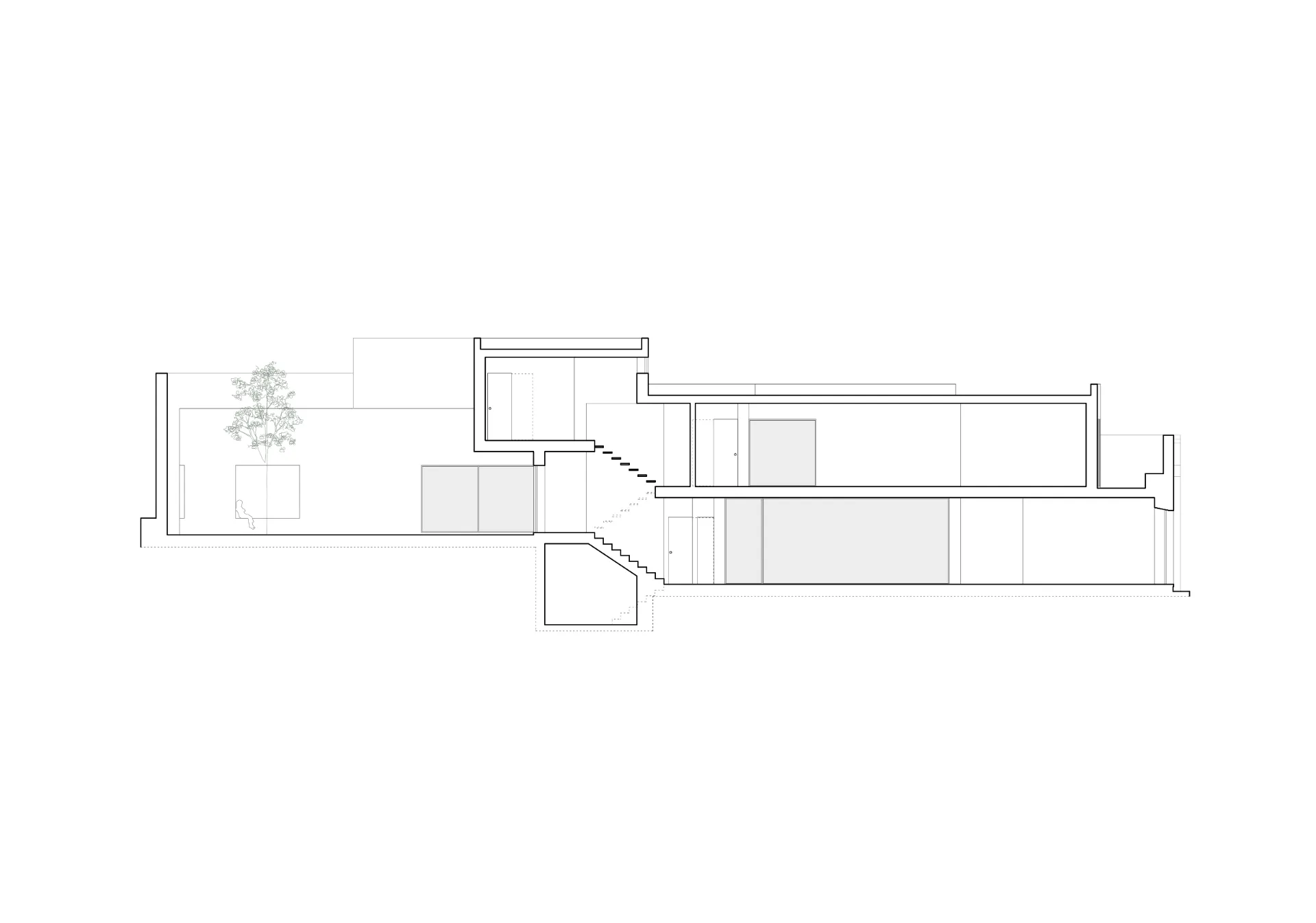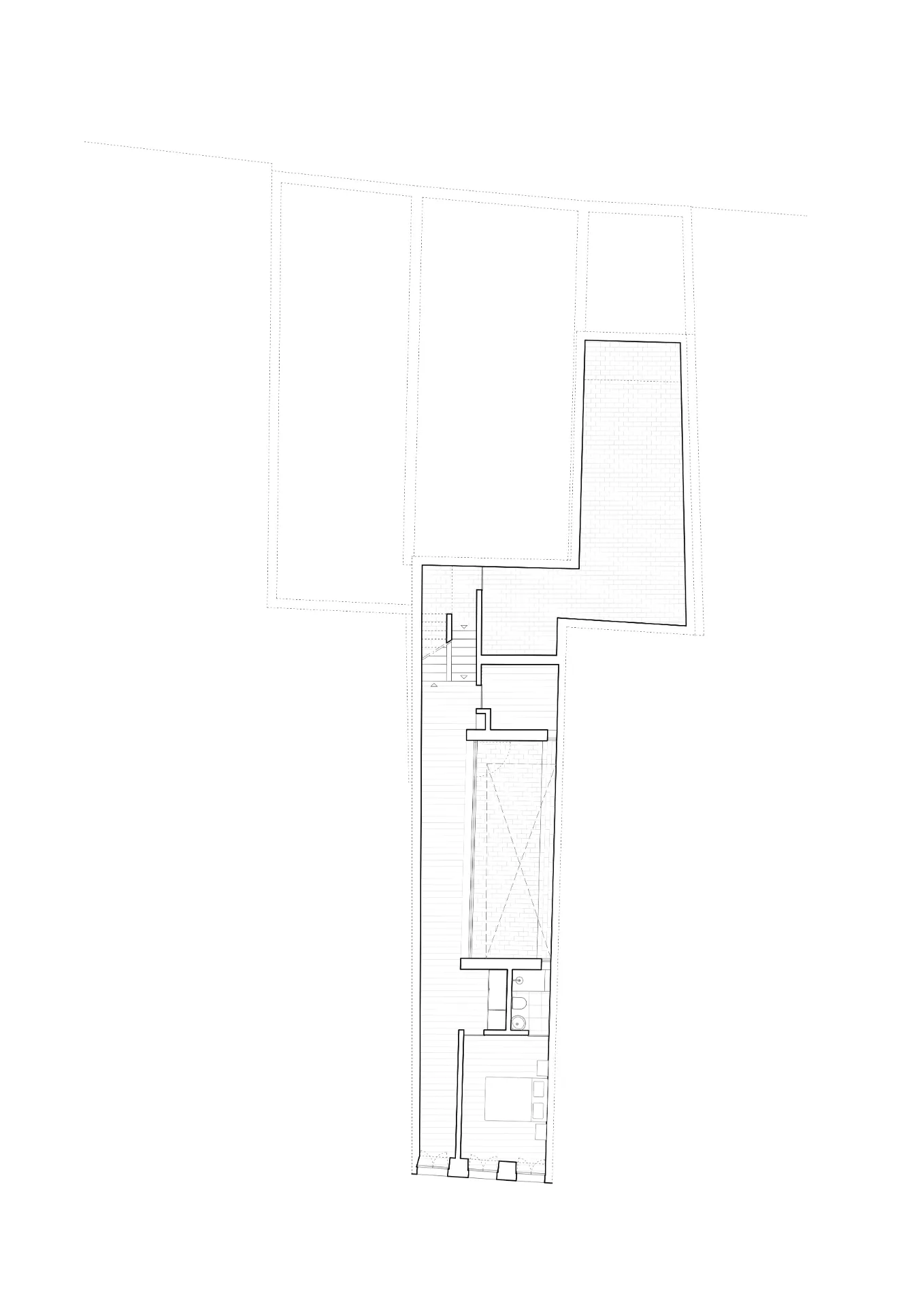 O conjunto dos edifícios encontrava-se em ruína, apenas conservando a fachada sul, característica do início do século passado, e o muro de logradouro a norte. A solução encontrada passa pela “construção” da diferença de cotas existente entre o espaço do rectângulo e o espaço do quadrado, e pela sua conversão no módulo de meio piso de escadas que, repetido na área de transição, organiza a distribuição dos compartimentos em altura.