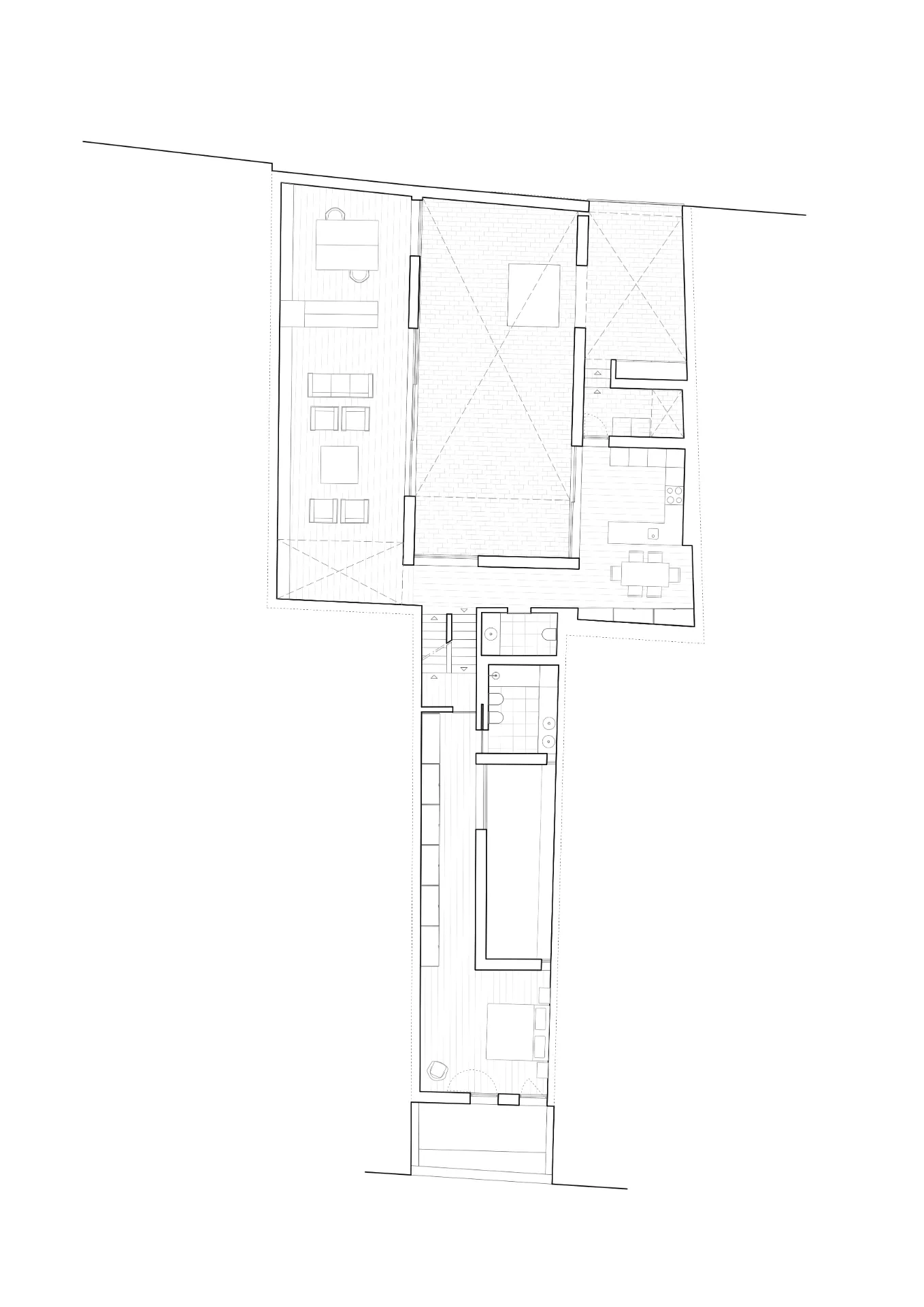 O pátio maior resulta da sobreposição do espaço do rectângulo alongado e do espaço do quadrado que se converte, frequentemente, num espaço único.